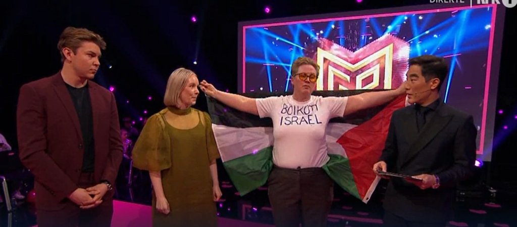During the first of four shows in Norway’s Melodi Grand Prix national selection show, a pro-Palestinian protester interrupted the broadcast holding a Palestinian flag and wearing a t-shirt scribed with “boycott Israel”.